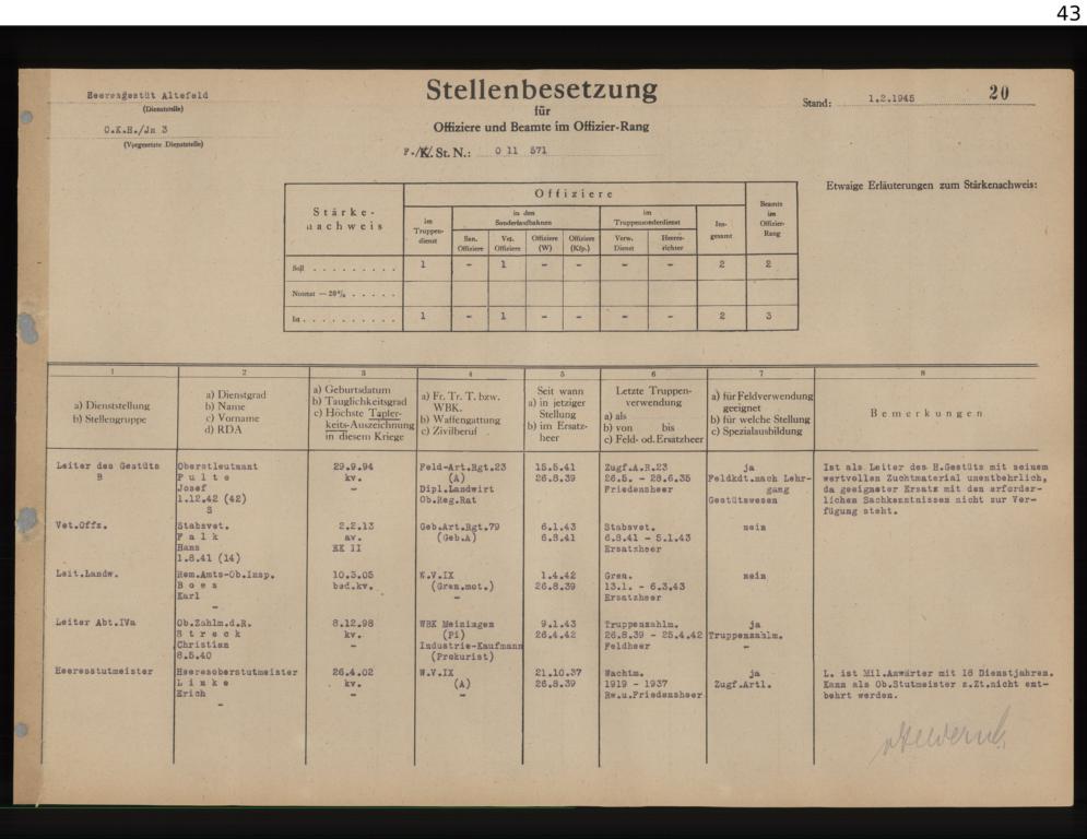 Major Dr. Josef Pulte übernahm offiziell die Leitung am 15. Mai 1941 in Altefeld als Heeres – Vollblutgestüt. Während der deutschen Besetzung Polens und Frankreichs wurden dort wertvolle Zuchtpferde erbeutet, die man dem Gestüt Altefeld übergab. Mit seinem eigenen Rennstall auf dem Gelände der Galopprennbahn Hoppegarten in Berlin nahm das Gestüt auch wieder erfolgreich bei Pferderennsportveranstaltungen teil.
