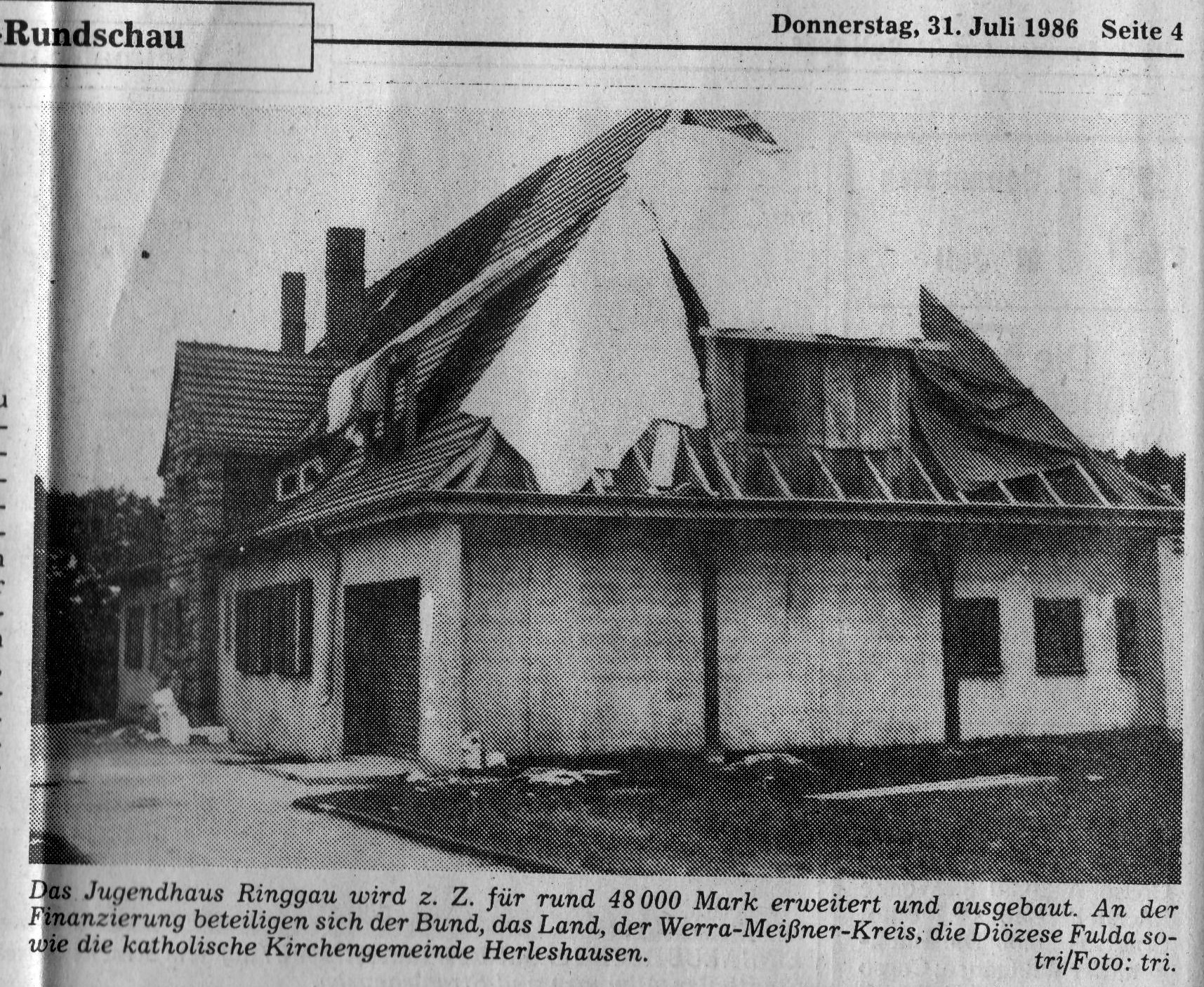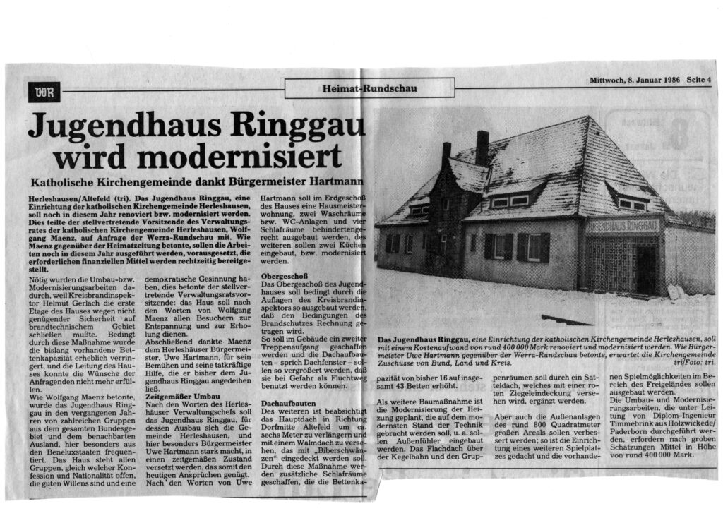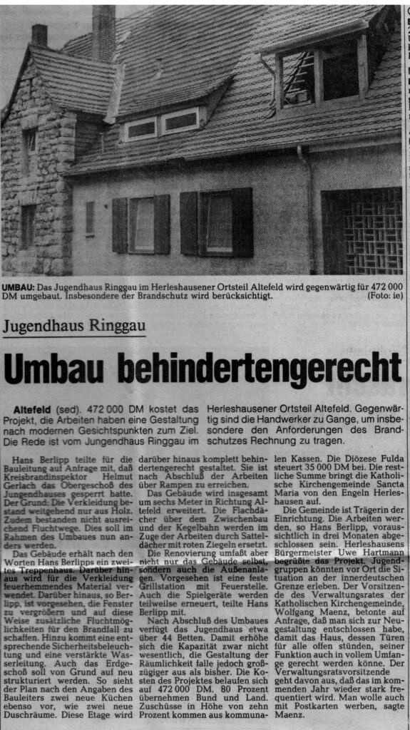 In dem Haus waren in den letzten zwei Jahren die Wirtschaftsräume für ein Jugendzeltlager untergebracht. Zahlreiche Männer arbeiten bereits an dem Bau. Durch die Eigenarbeit sollen 40 Prozent der Kosten aufgebracht werden. Die fehlenden 60 Prozent erhofft man aus Mitteln der Jugendarbeit. Da der Ringgau durch seine Höhenlage für Zeltlager oft zu kalt ist, sollen die Jugendlichen künftig im Heim untergebracht werden. 40 Betten sind bereits erworben. Viele freiwillige Helferinnen und Helfer unterstützen den Umbau unentgeltlich.